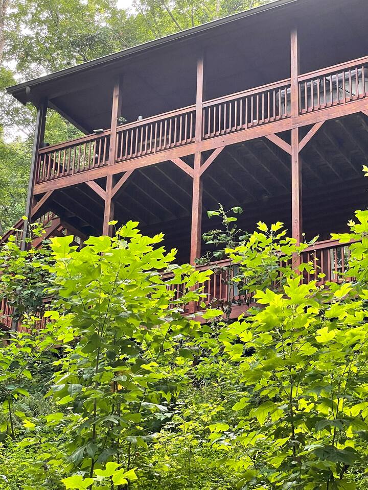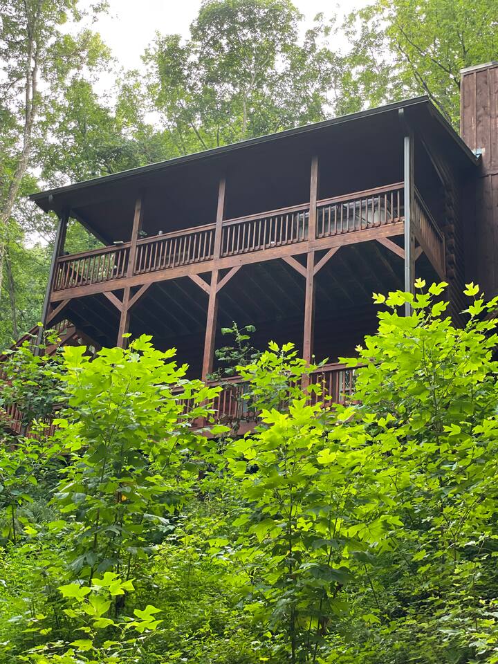 Experience the perfect blend of rustic charm and modern comfort in this stunning 3-story log home. Nestled on four private acres within a peaceful wildlife sanctuary, it's an ideal mountain retreat. Living Spaces: The open-plan living area features authentic log construction and a magnificent stone fireplace, creating a warm, inviting atmosphere. Outdoor Living: Enjoy serene mountain mornings on one of two spacious decks where you might spot local wildlife. Unwind in the private hot tub located on the second-story deck, surrounded by crisp mountain air. The downstairs game room includes a pool table for hours of fun. Fully equipped kitchen and a washer and dryer are provided for your convenience, so you can pack light and feel right at home. This authentic 3-story log cabin offers open living spaces, modern comforts, and the tranquility of a private 4-acre wildlife sanctuary Located Seven minutes from the center of downtown Helen, Georgia and all that Helen has to offer. Fly Fishing (lessons available), Tubing, Mining, Exploring the Mountains, Rivers and Winery's. Wine Tasting, Carriage Rides, Shopping, rollercoaster, zip lining, horseback riding and Fine Dining. Enjoy beautiful horseback riding by the river at Chattahoochee Stables. Try out Cowboys & Angels restaurant and enjoy some delicious food while listening to music. If you are bringing your family dog, there is plenty of things for them to do as well and we are pet friendly. Everything is provided for you, so pack light.